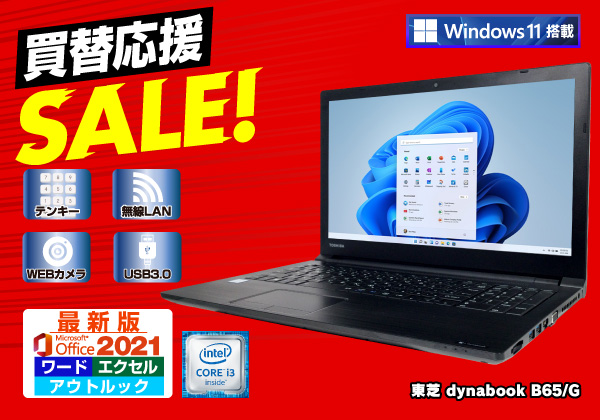 東芝 dynabook B65/G(CPU:Core i3 6006U 2GHz/メモリ:8GB/SSD:256GB) 最新Microsoft Office搭載Windows11モデル♪ カメラ、テンキー搭載でビジネス用にオススメ!WEB広告