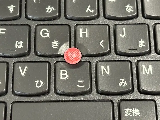 ThinkPadの特徴でもある、キーボード中央にある「赤いポッチ」!慣れると使いやすいトラックポイントも搭載!(少し色落ちしています)