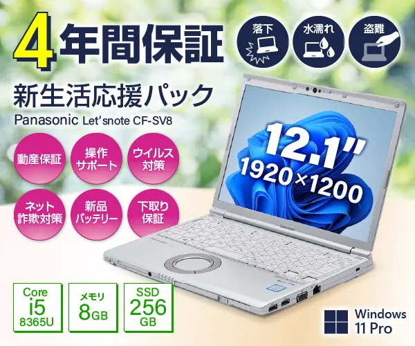 Panasonic Let's note CF-SV8(CPU:Core i5 8365U 1.6GHz/メモリ:8GB/SSD:256GB) 4年保証に新品バッテリーに交換済み!新生活応援パック♪WEB関東